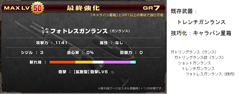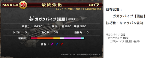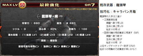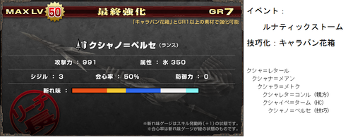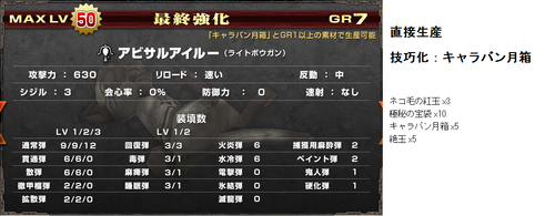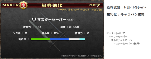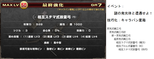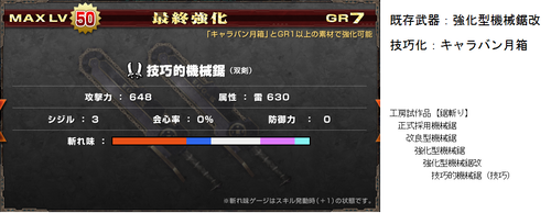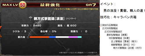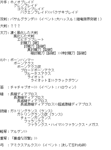 G級技巧武器一覧(≧ω≦ ) データ 武器防具 2014年10月31日 いろいろ増えてきてどれがなんだかわからんなってきた・・ 現状わかってる追加分(>>止まりは未確認) 今までのまとめ! まず技巧武器の特殊効果 ・パローネ大航祭でのCP増加(キャラバンの★でも) ・武器捌き(抜刀納刀スピードUP) ・移動速度上昇(納刀時) 親方・HCに分岐する場合はどちらからでも技巧化可能 片手剣 ※ヒプノック劇場(公式) 双剣 大剣 ※紳士淑女の仮面パーティー(公式) ※よみがえる工房の夢(公式) ※あくなき工房の夢で生産できる方から強化可能 太刀 ※工房秘蔵の試作品(公式) ハンマー ※男の浪漫!貫徹、職人の道(公式) ※黒き因縁を打ち砕け!(公式) 狩猟笛 ※紅と蒼の旋律(公式) ランス ※ルナティックストーム(公式) ガンス ※生産は3種類から可能 ライト ※奪還!秘密兵器(公式) ヘヴィ ※覇道(公式) 弓 ※謎の発行体と遭遇せよ!(公式) 紙集めなんかには最適だと思うので作れるのは持ってるほうがいいかと(≧ω≦ ) 以上稀kirin凛♪でした~(*>∀<)ノ))★ ランキング参加してみました(*゚艸゚) [1回] http://kirinwiiu.3rin.net/%E3%83%87%E3%83%BC%E3%82%BF%E3%80%80%E6%AD%A6%E5%99%A8%E9%98%B2%E5%85%B7/g%E7%B4%9A%E6%8A%80%E5%B7%A7%E6%AD%A6%E5%99%A8%E4%B8%80%E8%A6%A7-%E2%89%A7%CF%89%E2%89%A6%20-G級技巧武器一覧(≧ω≦ )