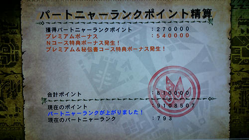パートニャー派遣・・・(*´-ω・)ン? 育成 パートニャー 2014年07月28日 とりあえずここまででわかったことを一旦整理します♪ まず仕様・・ パートニャーは同行設定さえしとけばPT組んでもPNRPがもらえます♪ ※ただし、パートニャーポーチはクエに出てきてる状態でないと使えない PNRP算出方法は課金等々で増えているものも合算されているらしく・・・ ・HR、SR帯クエは合計HRPの0.25倍 例)覇種アルゴル HRP9000*3(レア度)*3(プレ秘伝)*2(報酬ブースト)=162,000 HRP 162,000*0.25=40,500 PNRP これにプレだと*3がされてるようで・・121,500PNRP ・G級クエは合計GRPの1.25倍 なんですが・・G級のGRPってベースが低いものしかないので ヌコ上げには向かない(´・ω・`) ということは・・ SR帯以上であればレア度を合わせて、HCクエでHRPに3倍補正でウマウマ(*>∀<) G武器にはレア度シジルで(ry 自分で推薦状等々を持つのも・・カンストしてなければあり・・かな?(要検証) 当然ブーストタイムがある人は・・・おわかりですよね(*>∀<) 現段階では猟団トレジャーに出す為にPNRを上げるって感じかな? とりあえずマイサポートの看板でパートニャー派遣ー猟団部屋でだしときましょw これ・・ログアウトしても派遣して出発させとけば残るみたいなので ソロ団なんかはサブからも出しとくといいかも♪ 公式によると ってことなのでPNR上げるのと色を合わせるのがよさげ(*>∀<) 色はヌコの毛色ではないので要注意w 武器をかえると特性色ってのが変化するのですが・・ いまいちどれでどうなるのかよくわからん(´・ω・`) この旗の色とヌコの色を合わせるといい・・らしいw 出すところで報酬の内容が変化します♪ 基本出発して30~45分でかえってくるので 猟団部屋でトレジャーネコから報酬をもらう(*゚艸゚) そのときにたまに「お宝発見報告があります」って出る時があるので 地図クエなんかでそのお宝を探しにいくと・・ 猟団員みんながもらえるお宝が手に入る(*゚艸゚) それはトレジャーネコのとなりにあるカゴのお宝ってところで受け取れますw が、現状では・・・ 「全員が受取をしないと手紙が消えず3P埋まったらお手上げ」 らしいので、とりあえず受け取りをわっすれっずにぃ(*>∀<) どうやらメンテでリセットされるようです^^; ちなみにトレジャー隊お土産ってのは 自分のパートニャーをいっぱい使ってもらうとなにかしらもらえる様子(詳細不明) G5で追加されたカフやらピアスやらで使うものがココで手に入るので 出来る限りもらっときましょ~(*>∀<) 以上稀kirin凛♪でした(*>∀<)ノ))★ 追記:トレジャー隊お土産はどうやら昼12時~昼12間で使われた回数によって報酬が変化しそうな気配w ランキング参加してみました(*゚艸゚) [2回]PR http://kirinwiiu.3rin.net/%E8%82%B2%E6%88%90%E3%80%80%E3%83%91%E3%83%BC%E3%83%88%E3%83%8B%E3%83%A3%E3%83%BC/20140728パートニャー派遣・・・(*´-ω・)ン?
