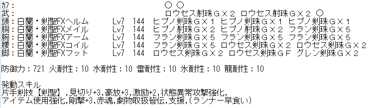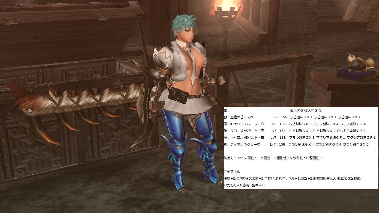 ラスタ改造計画第参弾(*>∀<) 装備 ラスタ 2014年07月27日 せっかく生産券が手に入ったのと、 ちまちま集めてた片手剣魂がBOXを圧迫してたので・・・ 剣聖を完成させました(o´艸`o) 前回のスキルが・・ 激励+2,見切り+3,豪放+3,早食い,斬れ味レベル+1,剛撃+2,劇物取扱皆伝,状態異常攻撃強化,いたわり+1,赤魂,(集中+1) 今回で・・・ 片手剣技【剣聖】,見切り+3,激励+2,状態異常攻撃強化,豪放+3,剛撃+3, 火事場力+2,いたわり+1,溜め威力UP+1,劇物取扱皆伝, (アイテム使用強化早食い) (*´-ω・)ン? なにかしら中途半端な気もするなぁ・・・ ま・・これでガルバまで放置するかな(*゚艸゚) ランキング参加してみました(*゚艸゚) [2回] http://kirinwiiu.3rin.net/%E8%A3%85%E5%82%99%E3%80%80%E3%83%A9%E3%82%B9%E3%82%BF/%E3%83%A9%E3%82%B9%E3%82%BF%E6%94%B9%E9%80%A0%E8%A8%88%E7%94%BB%E7%AC%AC%E5%8F%82%E5%BC%BE---%E2%88%80--ラスタ改造計画第参弾(*>∀<)