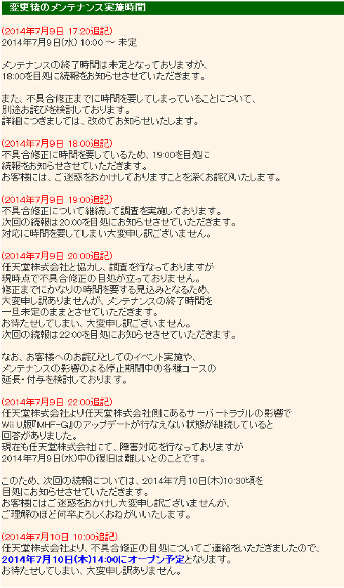 GGお疲れ様でした~☆(o・ω・o)ゝ 雑記 雑記 2014年07月23日 4/23~始まったMHF-GG・・3か月間お疲れ様でした(*´▽`*) 思い返せば・・・穿龍棍や穿龍棍や穿龍棍・・・・ ってな印象が強すぎた気がががw ほんとはいろいろあったのよねぇ・・w MMはズレるわ・・3乙バグでパト子はタイムスリップするわ・・ パネーヨはお守りがどうとかこうとか・・・ アスール再配信するって喜ばしといてからの~不具合緊急メンテ(´・ω・`) えっぐいのは・・W鯖は時間直前で緊急メンテ放棄されたのよねぇ・・・ って言い続けてたらさすがに萎えるからソロソロ・・・ いや!! 一つ大事なこと言いたい! 一番最後に来てた全鯖緊急メンテ騒動プリ(*`З´*)プリ あれね・・・どうしても納得できないことがあるのね(´・ω・`) 記録としてココに残しておきます(´・ω・`) 不具合>緊急メンテの流れはしょうがないと思うのよ・・・ こんだけいろんなこと出来るもんだからある程度はしょうがないかなと・・ ただ・・W鯖の対応(´・ω・`) 10:00~16:00の定期メンテから延長でずっとメンテになってたのです・・ で・・結局28時間連続メンテって形になったのですが、 運営側の言い分は・・・ 一方的に任天堂が悪いってようにしか見えないのがまず一つ! のわりには任天堂の公式コメの一つもないのも納得いかない(´・ω・`) さらに・・・機械相手だから不具合はしょうがないけど、 とある方の話によると任天堂に電凸したそうです・・ 7/10のAM8:00には鯖が通常どうり稼働してたらしいのです・・ とすれば、そこからアプデにかかって14時になったのかなぁ?ってのは まだ想像できる範囲内 ・・・・・・なぜもっと早くアプデが出来ないっていわないの(´・ω・`)? 22時になってからアプデがうんぬん・・・ これ・・仮に一番初めの17:20に言ってれば・・無駄に待つ必要なくなってたんじゃない? 任天堂の鯖がなおってからアプデになるから最低でも6時間はかかるって言ってればさ(´・ω・`) そしたら今日は無理だなぁ・・で頭切り替えれると思うんだけどなぁ(´・ω・`) うしwすっきりした(*゚艸゚) さて・・GG最後の夜・・ とうとうあのギルドマスター(そろそろ名前くれてもいんじゃない?) 一時撤退のご様子(´・ω・`) ちょっと記念撮影でもしとこ(*゚艸゚) HR初期から多岐に渡り・・お世話になりました。゚(PД`q。)゚。 グッo(´・з・`)ノ))バァーイ 今度は塔とやらで帰ってくる・・のかな(*´-ω・)ン? 以上稀kirin凛♪でした(*>∀<)ノ))★ ランキング参加してみました(*゚艸゚) [2回] http://kirinwiiu.3rin.net/%E9%9B%91%E8%A8%98%E3%80%80%E9%9B%91%E8%A8%98/gg%E3%81%8A%E7%96%B2%E3%82%8C%E6%A7%98%E3%81%A7%E3%81%97%E3%81%9F%EF%BD%9E%E2%98%86-o%EF%BD%A5%CF%89%EF%BD%A5o-%E3%82%9DGGお疲れ様でした~☆(o・ω・o)ゝ