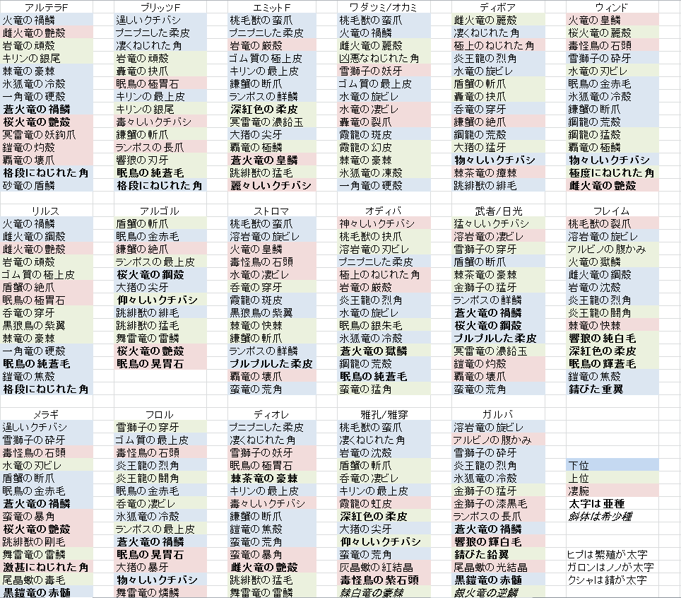| 20~24 | アルテラ | メラギ | ガルバ | 雅孔 | オディバ | 武者 | フロル | ------ |