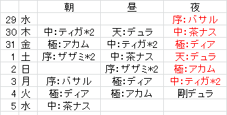 | 11(土) | レイア亜 | ラー | ヒプ | 錆クシャ |